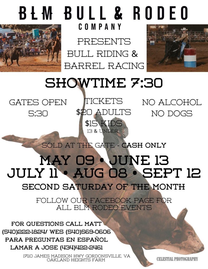 Oakland Heights Farm is hosting BLM Bull & Rodeo Co. events on the second Saturday of the month May thru September. BLM Bull & Rodeo Company presents one of the finest outdoor Professional Bull Riding events at Oakland Heights Farm. Professional bull riders and bucking bulls from across the nation will keep you on the edge of your seat while going head to head for an 8 second ride! BLM Bull & Rodeo offers a family friendly atmosphere, with music, ladies barrel racing, and extra entertainment featuring mini bucking bulls. Bring the whole family. There will be vendors and food concessions. Tickets on sale at the gate, $20 for adults, $15 for kids . They’ll see you rain or shine!